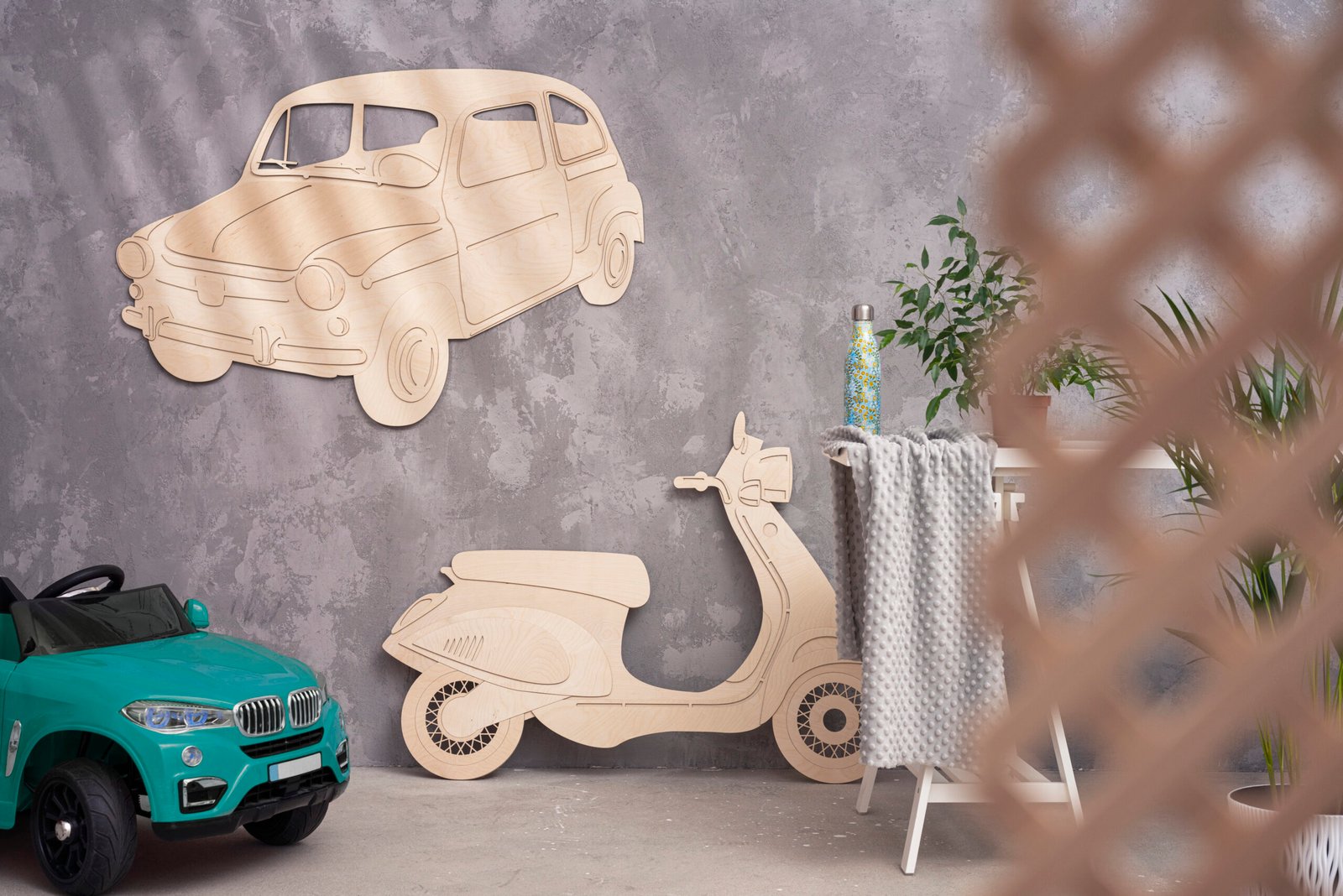 Dekoracja drewniana w kształcie auta. Dekorację można powiesić na ścianie lub oprzeć o podłogę.
